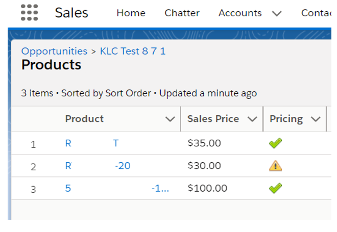 Use colored flags on Opportunity Products to give users insight into how the proposed Sales Price compares to pricing thresholds.